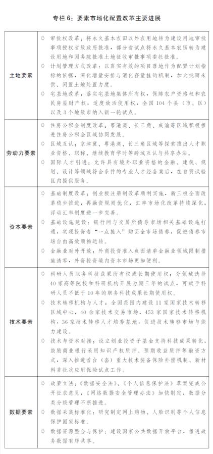 一是要素市场化配置体制机制进一步完善。深化土地计划管理方式改革,赋予省级人民政府更多自主权,启动新一轮农村宅基地制度改革试点,调整完善土地出让收入使用范围,优先支持乡村振兴。加快完善技能人才评价制度,民营企业职称评审渠道逐渐打通,区域一体化人才资格互认机制稳步推进。深化科技成果使用权、处置权和收益权改革,开展赋予科研人员职务科技成果所有权或长期使用权试点。开展公共数据资源开发利用试点,推进政务数据有序共享。制定建设高标准市场体系行动方案。