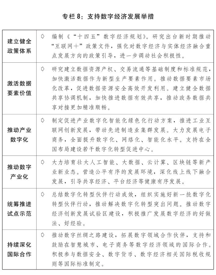 三是加力推动数字化发展。发展数字经济,推进数字产业化和产业数字化,打造具有国际竞争力的数字产业集群。培育数据要素市场,发挥好数据要素关键作用。推动数字政府建设,持续推进实施国家政务信息化重大工程,加快打造数字化一流营商环境。深入推进全国一体化大数据中心体系建设,做好数据中心建设布局,促进数据资源有序流通和创新应用。积极参与数字领域国际规则和标准制定。