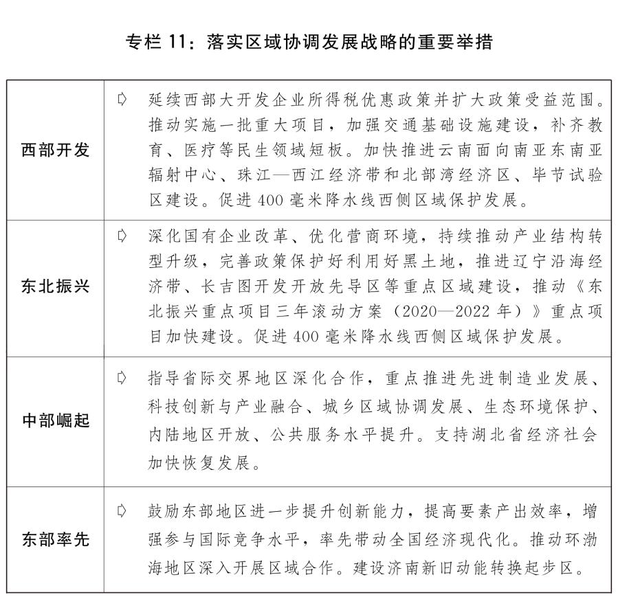 三是扎实落实区域协调发展战略。推动构建更加有效的区域协调发展新机制。研究出台西部大开发“十四五”实施方案和重点地区规划,继续实施西部大开发企业所得税优惠政策,执行新修订的《西部地区鼓励类产业目录》,推进成渝地区双城经济圈建设,打造带动全国高质量发展的重要增长极和新的动力源,提升关中平原城市群建设水平,促进西北地区与西南地区合作互动,积极推动西部大开发形成新格局。研究出台东北振兴“十四五”实施方案,着力推动东北地区产业结构调整优化,支持东北地区加大开放合作,推动东北振兴取得新突破。研究出台《关于新时代推动中部地区高质量发展的指导意见》,继续支持湖北省经济社会发展,促进中部地区加快崛起。大力推进山东新旧动能转换,支持福建高质量发展及平潭综合实验区建设,有力促进环渤海地区合作加快发展,深入推进淮河生态经济带建设,鼓励东部地区加快推进现代化。支持革命老区加快发展,贯彻落实《关于新时代支持革命老区振兴发展的意见》,促进民族地区经济社会发展,加强边境地区建设,加快推进资源型地区转型升级,支持老工业基地转型发展、承接产业转移。支持国家级新区、经济开发区、高新区创新发展。完善推进海洋经济高质量发展的政策体系,培育壮大海洋战略性新兴产业。