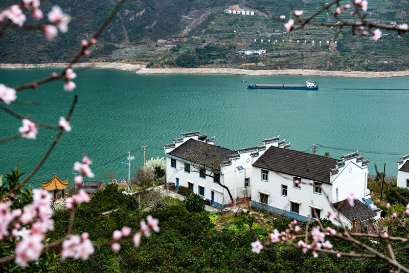 这是2021年2月27日在三峡库区秭归县屈原镇西陵峡村拍摄的鲜花盛开的脐橙园。湖北省宜昌市秭归县在建设美丽乡村中,因地制宜,在脐橙园里种植桃树、李树等果树。