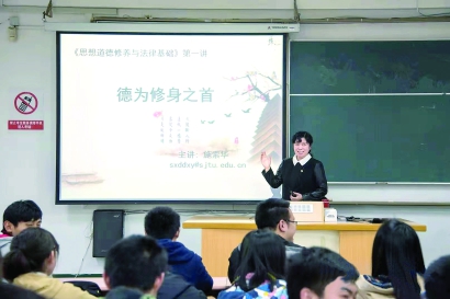 施索华每年都给大一学生上《思想道德修养与法律基础》。她上课时有一个习惯,就是不停地在教室里来回走动。在将近100人的大课堂上,她会关注到每一名学生,与每个人都有目光交流,甚至还给自己定了个“每名学生每次上课至少目光交流一分钟”的教学标准。