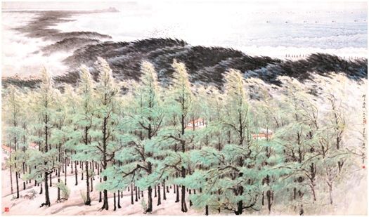 近处的树迎风而立,与远树一同构成一道道绿色屏障,该作品表现出具有南方海岸风情和时代色彩的“绿色长城”。