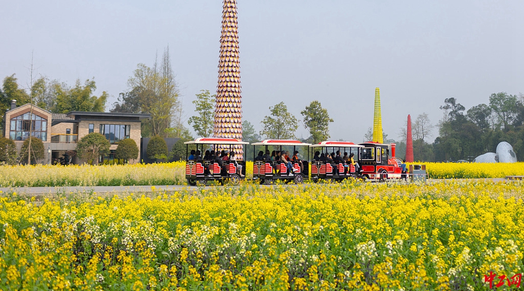 2021年3月13日晚,中国˙成都第二届天府大地艺术季在成都市郫都区农林艺术村启动。公园城市乡村表达:东林艺术村颠覆传统农业,激活农商文旅体商业场景。图为东林艺术村里田间小火车。