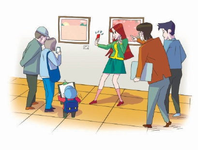一些网红在艺术展厅里拍照直播,往往不顾及其他观众的感受。漫画/琚理