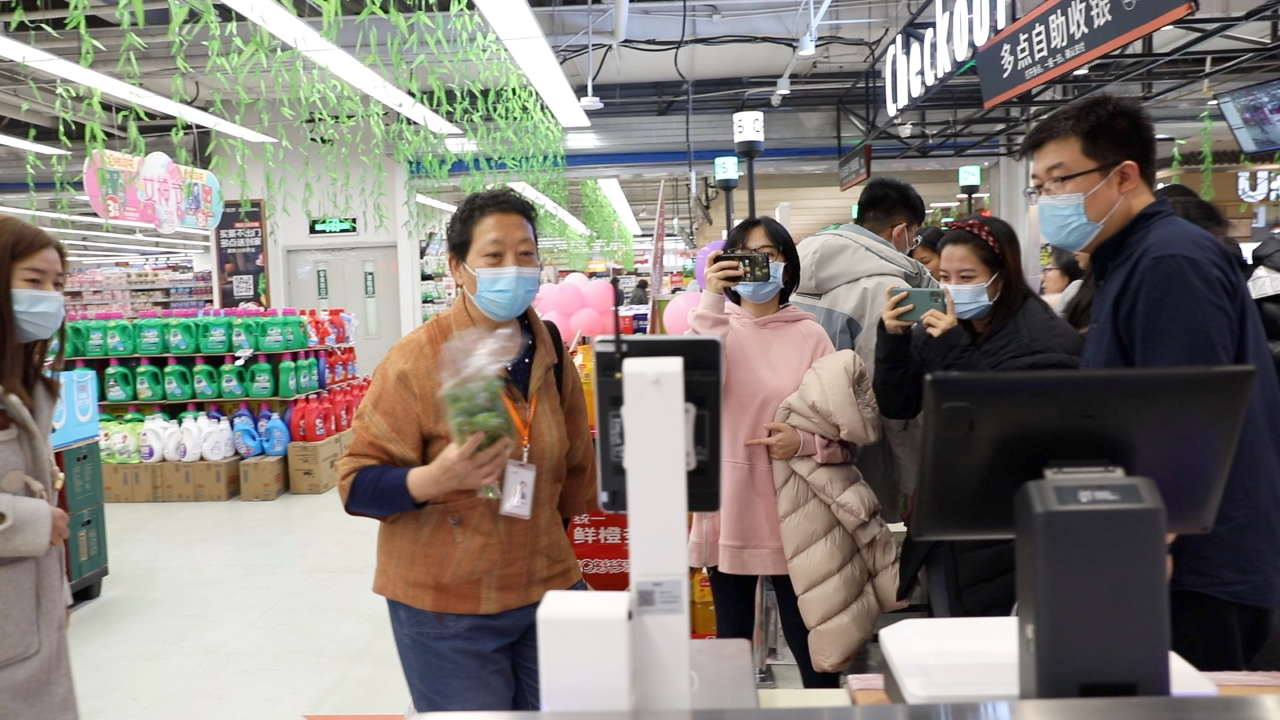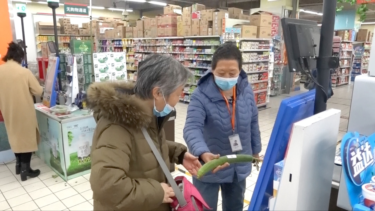 3月11日,在物美中关村店,郭宏焱帮助一名老年顾客自助结算。