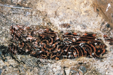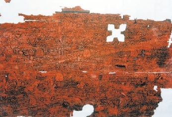 老山汉墓出土的丝织品。图中白色印记是将丝织品固定在棺板上的铜钉留下的。