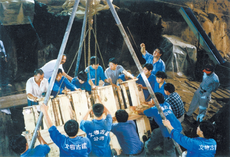 考古队员用木板把大漆案固定住,用吊车吊出来。