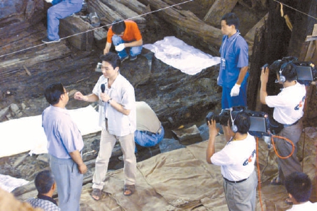 2000年8月20日,康辉在央视直播中采访老山汉墓发掘现场总指挥王武钰。北京日报记者 李继辉摄