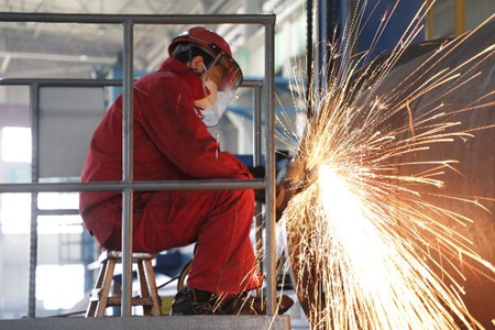 3月29日,在冀东油田机械公司组焊车间内,员工们或蹲、或躺、或站立,焊花飞舞,弧光闪现,一派热火朝天的景象。