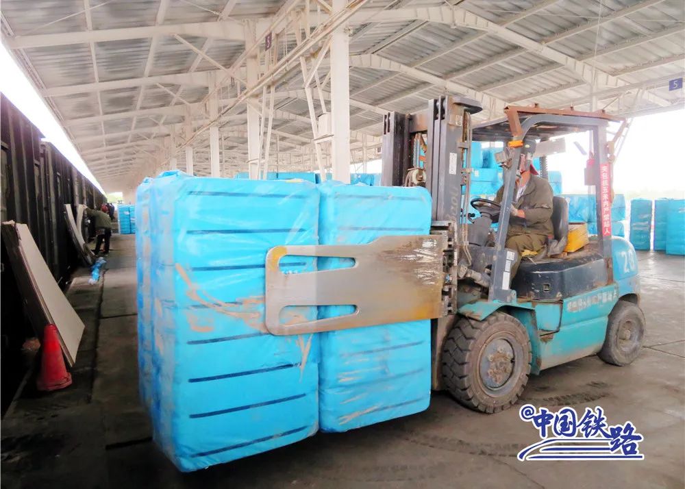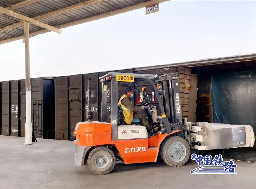 装运专列时,工作人员先用彩条布将车厢底部铺好,然后由专用夹包机将棉包运进车厢。一节车厢大约能装载43吨棉包,装车完毕后再用泡沫胶封门,这样操作是为了密封防火,确保运输安全。