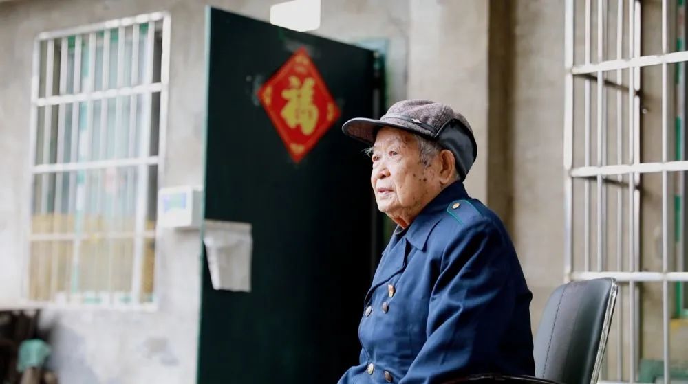 今年100岁的退休火车司机任忠德坐在自家门前(3月12日摄)。新华社记者 覃广华 摄