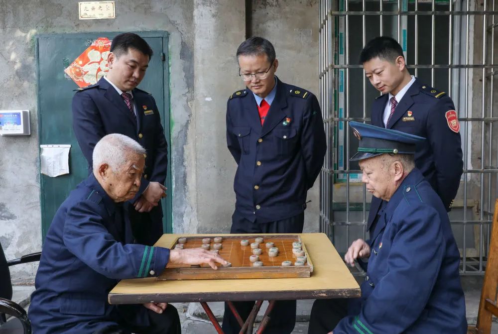 中国铁路南宁局集团有限公司柳州机务段的5名火车司机师徒聚在一起,任忠德(前左)和曹之耀在下象棋(2月7日摄)。新华社发(江晓 摄)