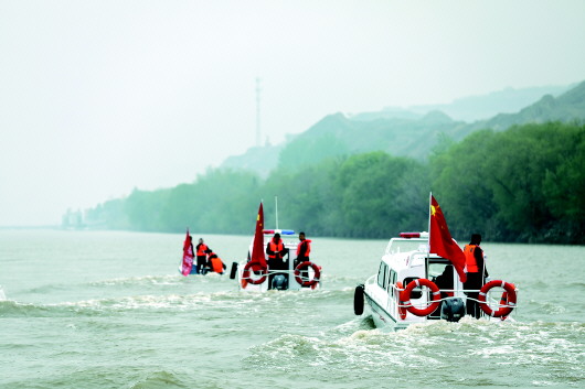 4月1日,渔政执法船在黄河陕西洽川段巡航。4月1日12时起,黄河进入全域禁渔期。当日,农业农村部和沿黄9省(区)农业农村部门在黄河陕西洽川段联合启动专项执法行动。 新华社记者都红刚摄