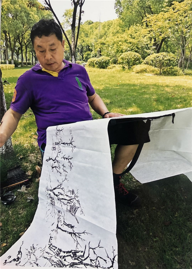 他谙熟石涛、八大、徐渭的理念,仰慕齐白石、李苦禅等大师,还得到过卢光照、尹瘦石、陈雄立等老师亲授,掌握了传统笔法、笔意,但是一旦投入沸腾的社会和包罗万象的大自然,这一切仍然显得无能为力。他领会到齐白石所说“学我者生,似我者死”的深刻含义,也愿意投入感情,乃至生命,磨砺自我,创造新的艺术境界。在他的《京杭大运河》中,树木的线条是从大自然中提炼出来的,仿佛在随风摇曳;花丛呼之欲出,也是蹲在画室里想象不到的;那些人物,就是熟悉的亲朋好友,与我们迎面相逢,擦肩而过……