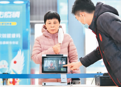 在山东省济宁市为民服务中心,市民通过人像识别核验系统查询健康码实时状态,实现“1秒”检码测温。杨国庆摄(人民视觉)