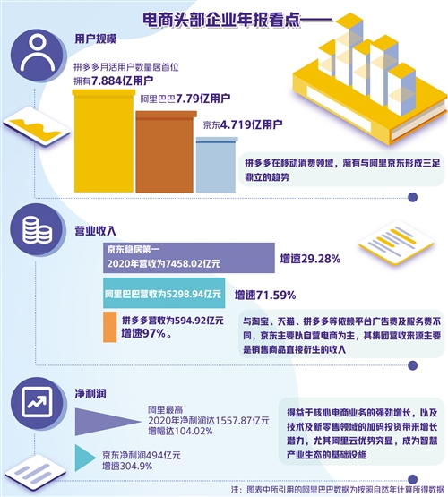 对比各大电商巨头的2020年财报发现(本文所引用的阿里巴巴集团数据按照自然年计算),京东营业收入占据首位,阿里巴巴的净利润最高,“吸金”能力有所增强,拼多多用户规模反超阿里,电商巨头在用户的争夺上各出奇招。