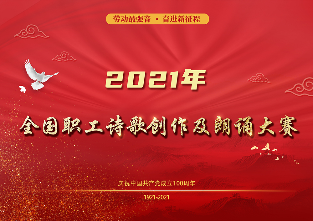 时逢建党百年,为歌颂100年来中国共产党带领全国各族人民同心同德、砥砺前行所取得的辉煌成就,展现中国工人阶级听党话、跟党走、奋进新征程的主力军风采,中工网特举办“劳动最强音·奋进新征程”2021年全国职工诗歌创作及朗诵大赛,以诗歌创作、朗诵为载体,生动讲述在党的领导下广大职工立足本职岗位、勇立潮头建新功的奋斗故事;生动讲述职工党员发挥先锋模范作用、忠诚履职尽责的感人故事,生动讲述劳模故事、劳动故事、工匠故事,广泛传播劳动创造幸福的价值理念。