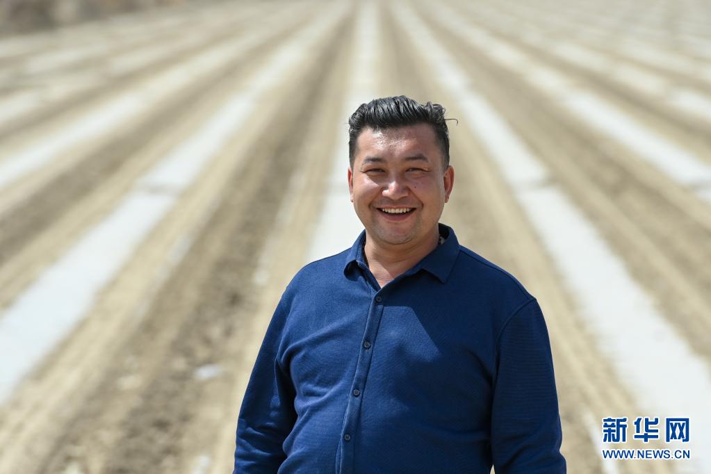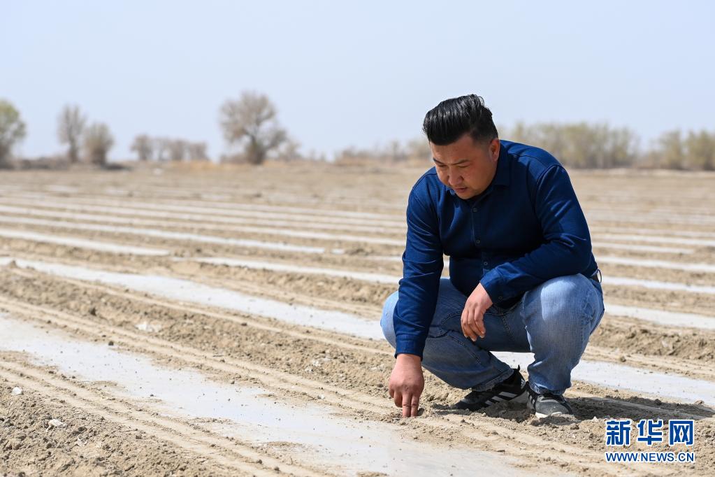 在新疆尉犁县兴平镇通其克村,地力夏提·买买提在自家刚播种完的棉花地里(4月13日摄)。