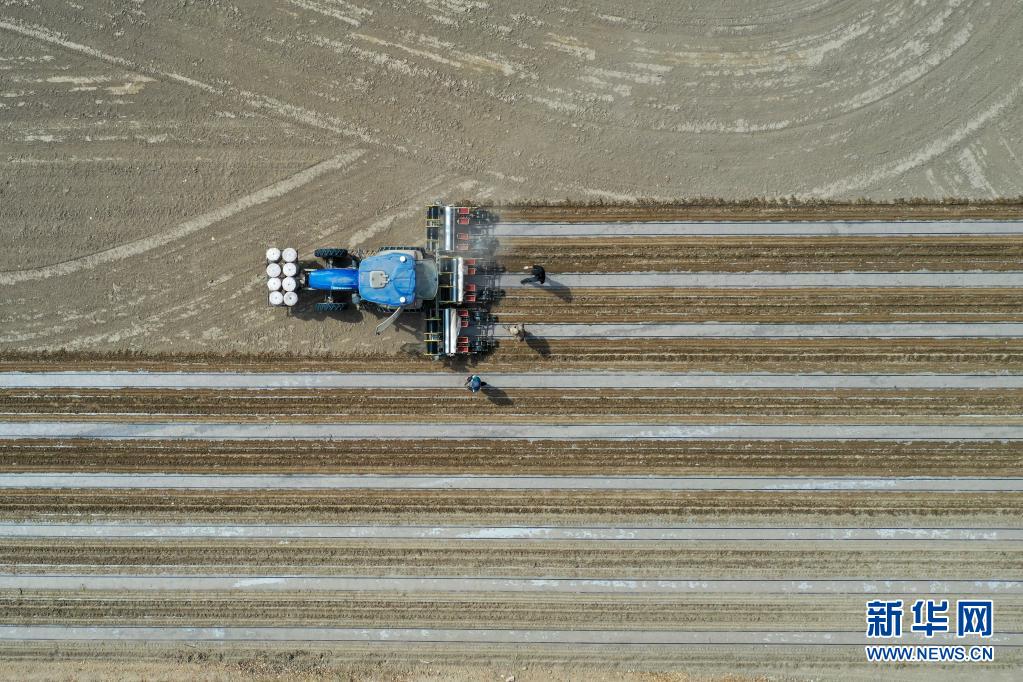 在新疆尉犁县兴平镇通其克村的一处棉花地,铺膜播种机在作业(4月13日摄,无人机照片)。新华社记者 丁磊 摄