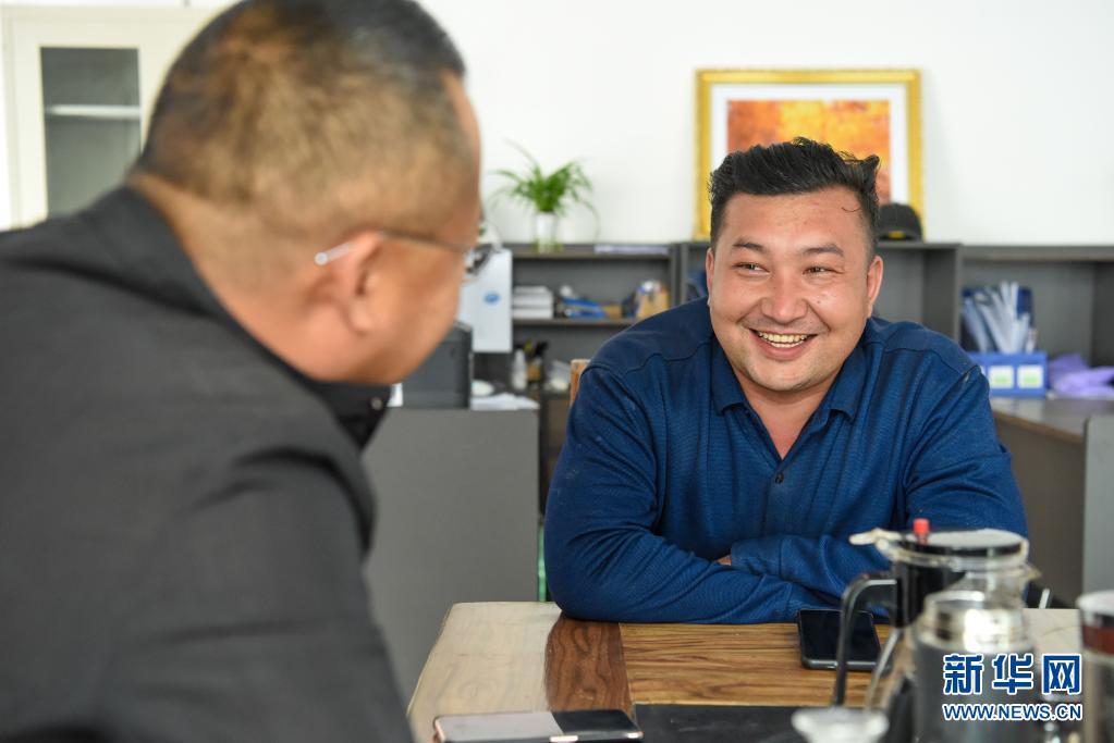 在新疆尉犁县,地力夏提·买买提(右)与合作伙伴商量农业服务公司的发展计划(4月13日摄)。新华社记者 丁磊 摄