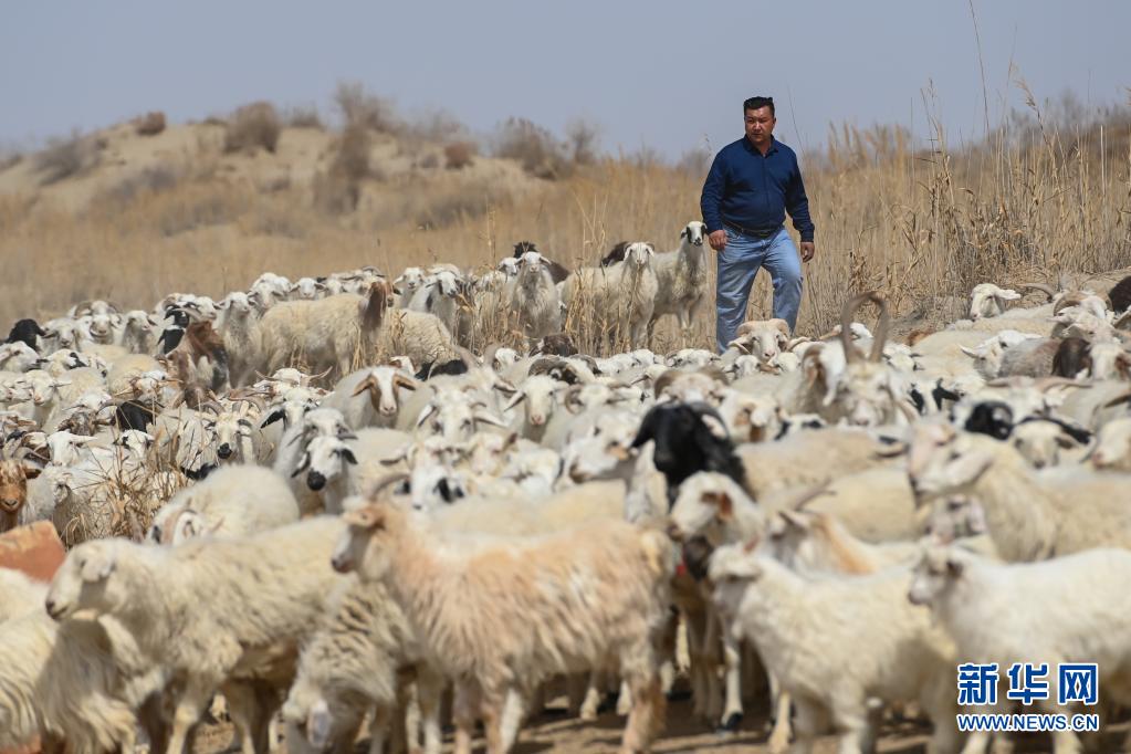 在新疆尉犁县兴平镇通其克村,地力夏提·买买提将羊群赶入羊圈(4月13日摄)。新华社记者 丁磊 摄