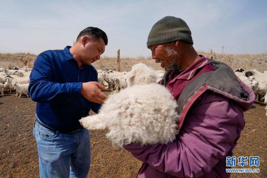 在新疆尉犁县兴平镇通其克村,地力夏提·买买提(左)在羊圈查看羊羔身体状况(4月13日摄)。新华社记者 赵戈 摄