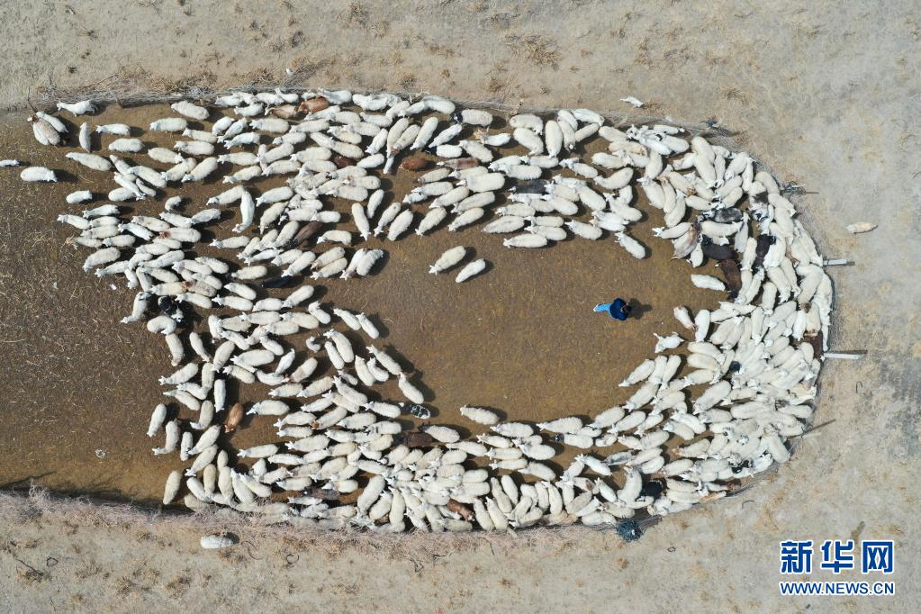 在新疆尉犁县兴平镇通其克村,地力夏提·买买提在羊圈中忙碌(4月13日摄,无人机照片)。新华社记者 丁磊 摄