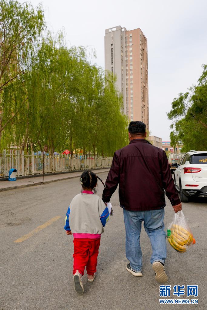 在新疆尉犁县,地力夏提·买买提(右)接女儿放学回家(4月13日摄)。新华社记者 赵戈 摄
