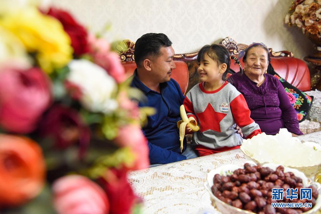 在新疆尉犁县,地力夏提·买买提(左)与家人聊天(4月13日摄)。新华社记者 丁磊 摄