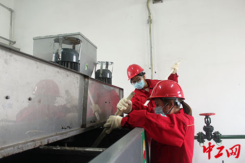 狭窄管线间,赵月婵和周迎新蜷在其中拆过滤器、连软管,动作娴熟,配合默契。一切准备就绪后,两个人在罐顶合力搅拌药泥,一人在罐底开关底阀,一人手持软管排泥进桶,大家相互协作,配合有度。