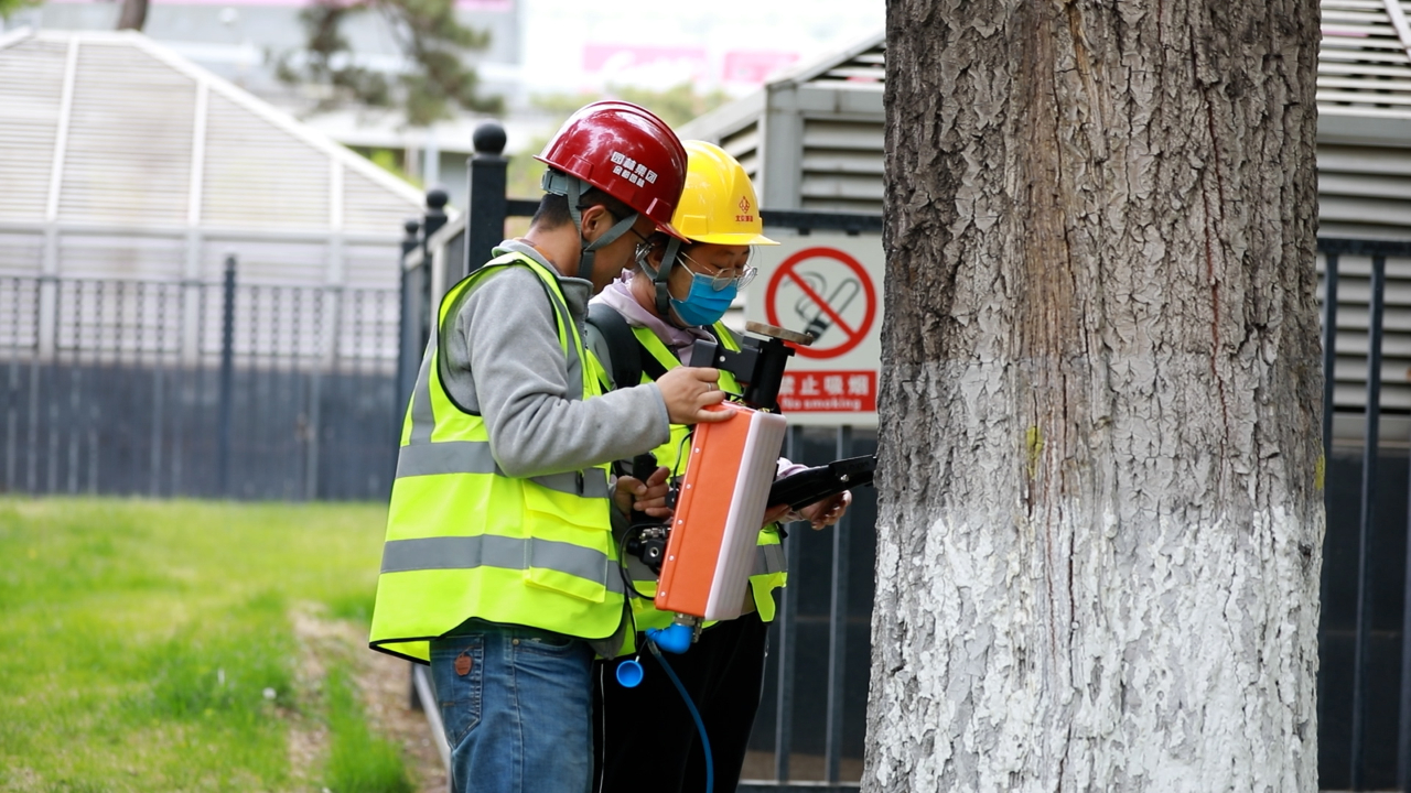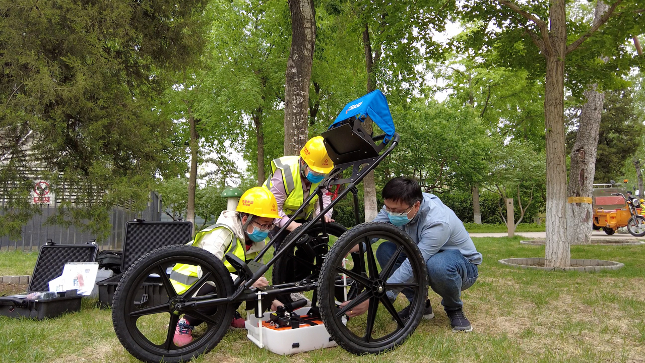 树木和人一样也需要定期体检,尤其是北京有许多古树或高龄树木。4月21日,高发明来到北京市公主坟绿地古树公园,和同事们用树木雷达检测仪,就树木的地下根系进行整体扫描。“通过检测仪我们可以看到整个根系的分布情况,检查哪些地方有根系,哪些地方没有根系,之后可以做到精准的复壮。”2021年,北京市即将开展古树名木的健康体检工作,高发明和同事们将负责东城、西城、海淀等相关区县的古树体检工作,为北京的古树建立更完善的电子档案。
