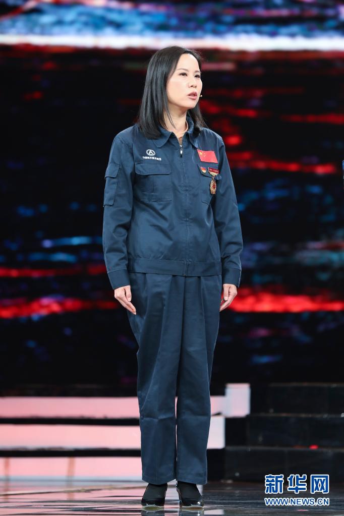 江西金力永磁科技股份有限公司生产车间的成型压机操作能手温小珍在北京举行的2021年“最美职工”发布仪式现场(4月22日摄)。