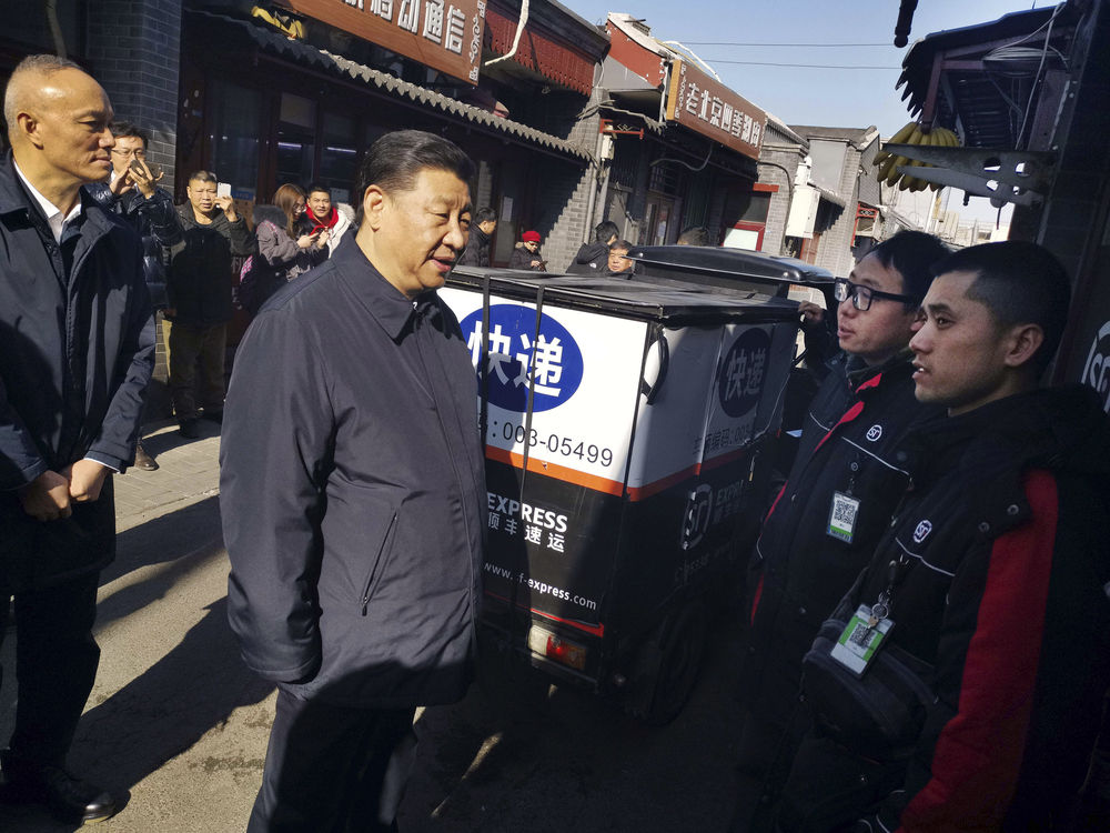 ↑2019年2月1日,习近平在北京看望慰问基层干部群众,考察北京冬奥会、冬残奥会筹办工作。这是习近平在结束前门东区看望慰问乘车返回途中,临时下车来到前门石头胡同的快递服务点,看望仍在工作的“快递小哥”。