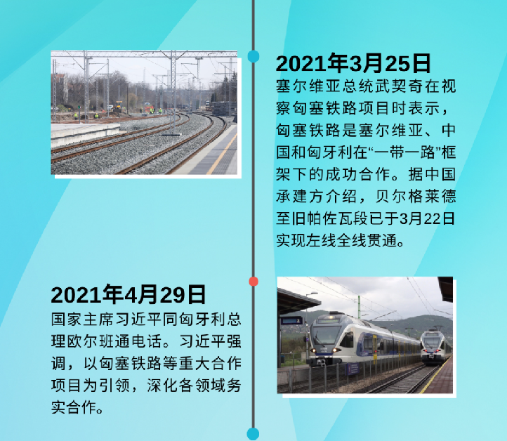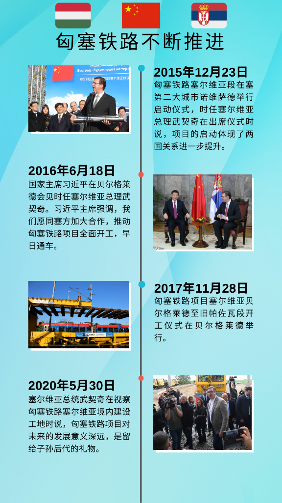 匈塞铁路项目也备受匈牙利和塞尔维亚领导人关注。欧尔班说,匈、中、塞三国合作建设匈塞铁路具有重要历史意义,将惠及各方。塞尔维亚总统武契奇多次视察项目建设情况,认为匈塞铁路是三国在“一带一路”框架下的成功合作,对未来的发展意义深远,是留给子孙后代的礼物。