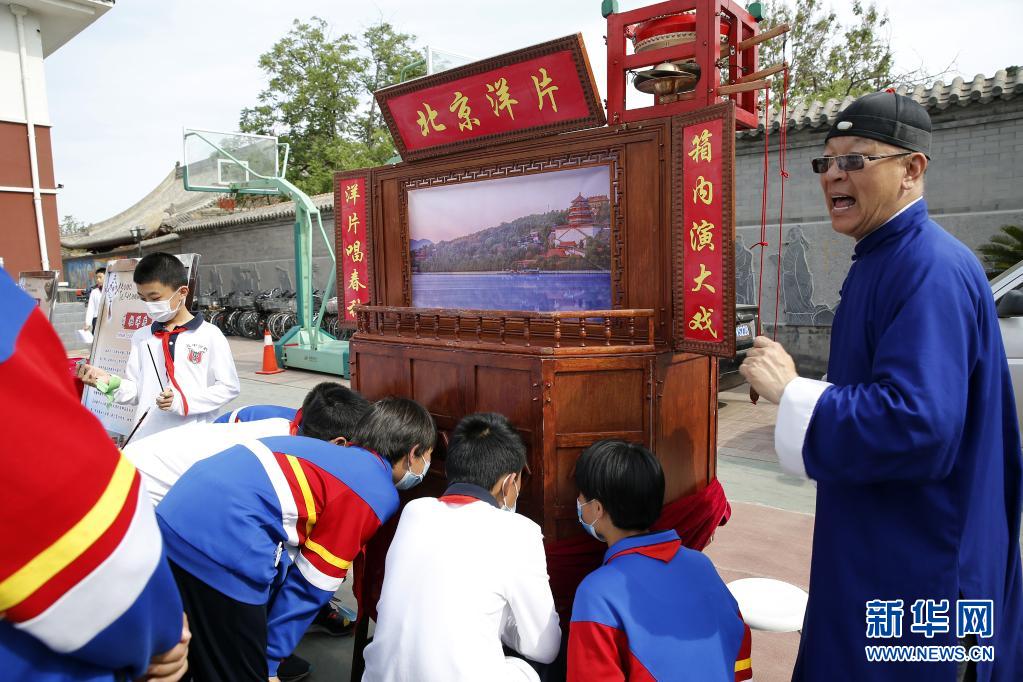 5月10日,学生们观看民间艺人展示的北京洋片。