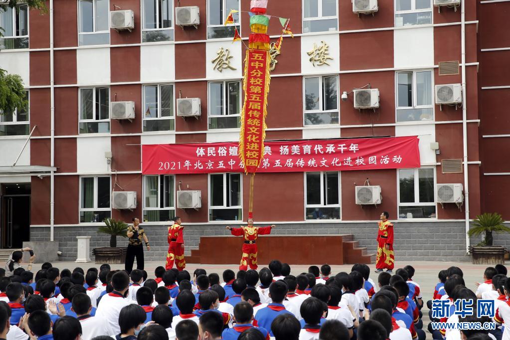 当日,北京市第五中学分校“第五届传统文化进校园”活动在学校操场举行。民间艺人应邀走进校园为师生们带来非遗项目表演,同学们积极参加游园式体验活动,感受传统民俗。