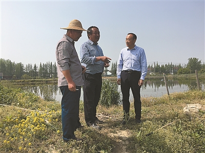 徐金松(右)带领技术能手指导困难职工养鱼苗。