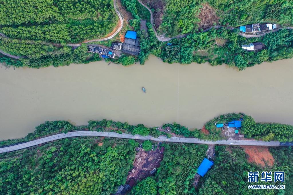5月13日,在广西贺州八步区黄洞瑶族乡黄洞渡口,赵仕斌摆渡村民过河(无人机照片)。