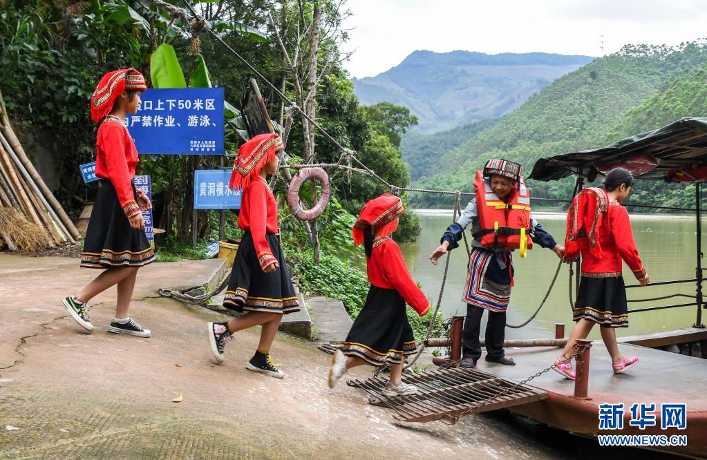 5月13日,在广西贺州八步区黄洞瑶族乡黄洞渡口,黄洞瑶族乡民族学校的小学生放学后来到渡口准备乘船回家。新华社记者 刘岭逸 摄