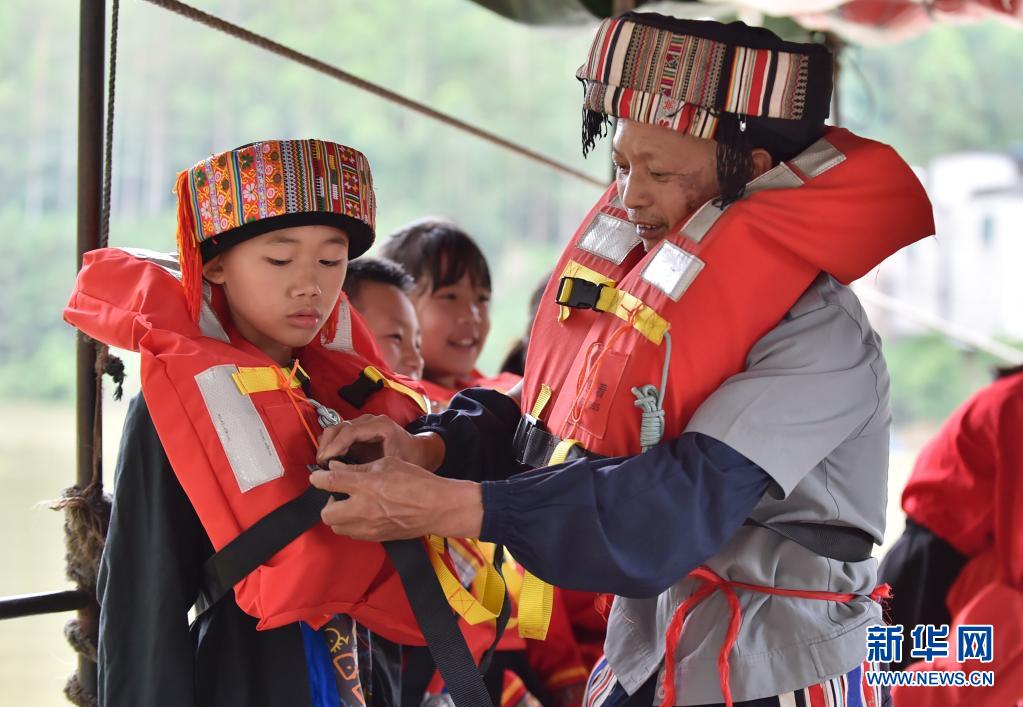 5月13日,在广西贺州八步区黄洞瑶族乡黄洞渡口,赵仕斌(右一)在渡船上帮助小学生穿戴救生衣。新华社记者 刘岭逸 摄