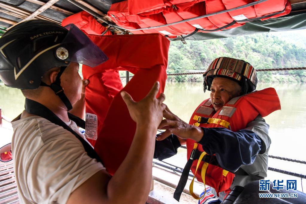 5月13日,在广西贺州八步区黄洞瑶族乡黄洞渡口,赵仕斌(右)协助村民穿戴救生衣。新华社记者 曹祎铭 摄