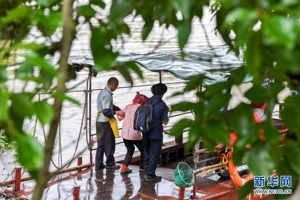 5月13日,在广西贺州八步区黄洞瑶族乡黄洞渡口,赵仕斌(右二)引导渡河的小学生上船。新华社记者 曹祎铭 摄