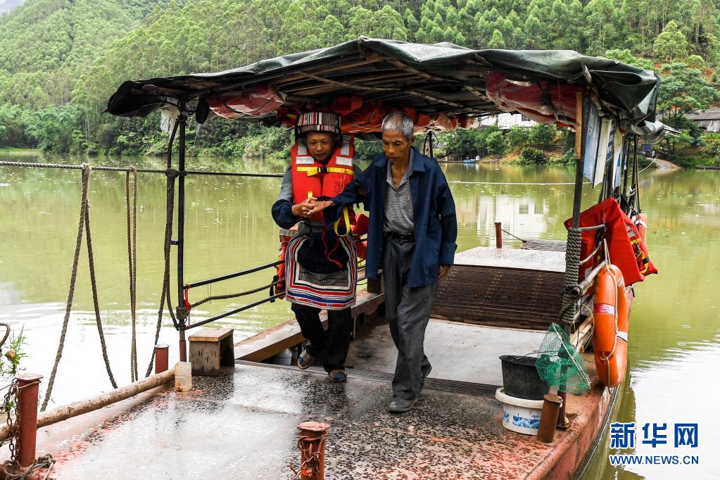 5月13日,在广西贺州八步区黄洞瑶族乡黄洞渡口,赵仕斌(左)搀扶腿脚不便的村民上船。新华社记者 曹祎铭 摄