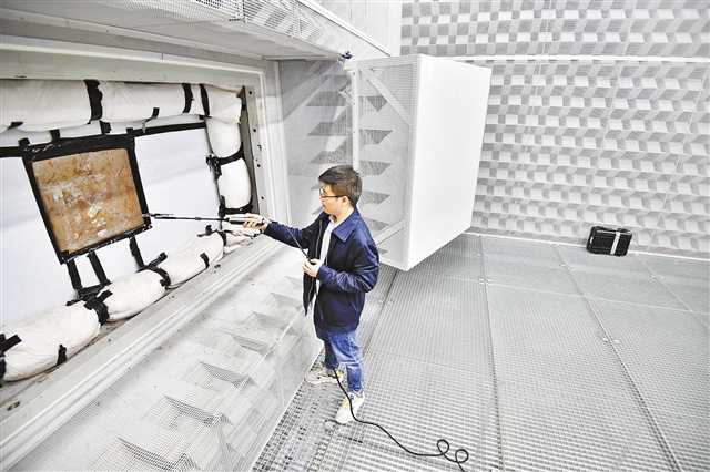 4月26日,中国汽研NVH技术中心全消声室,工程师正在测试隔音材料的隔音性能。