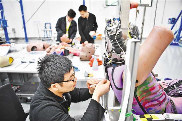 在碰撞试验假人标定实验室,记者看到几名工程师正在反复对假人进行调试和校准,或给假人身上安装传感器。
