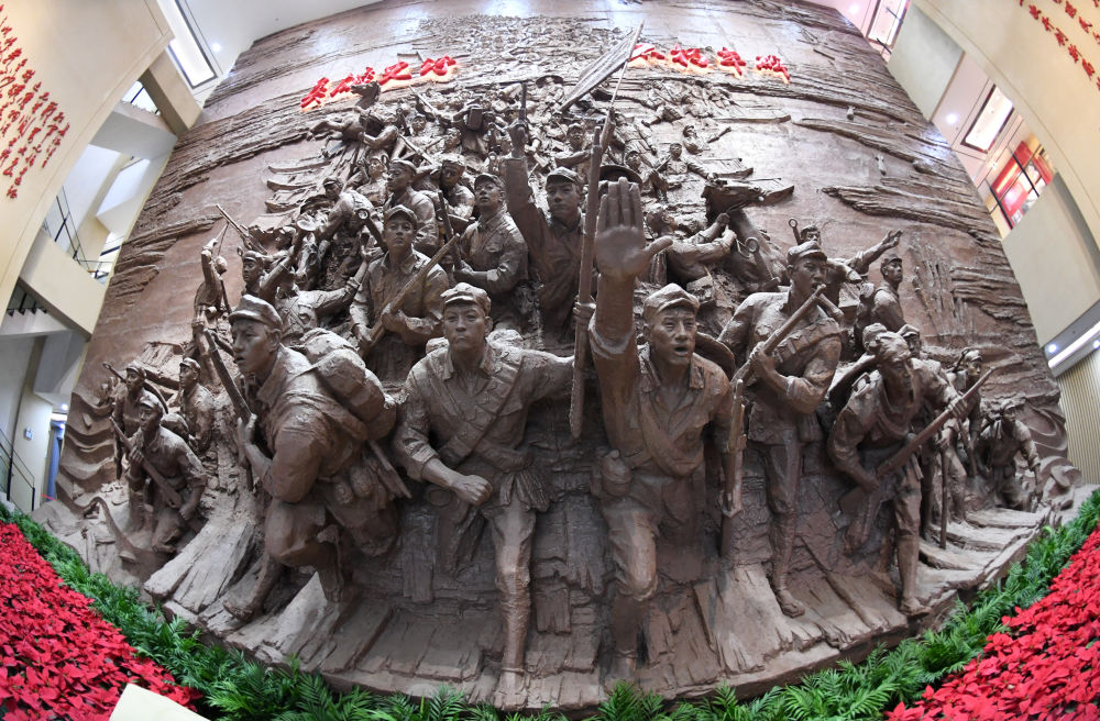 广西桂林全州县红军长征湘江战役纪念馆内的雕塑(4月26日摄)。新华社记者陆波岸摄
