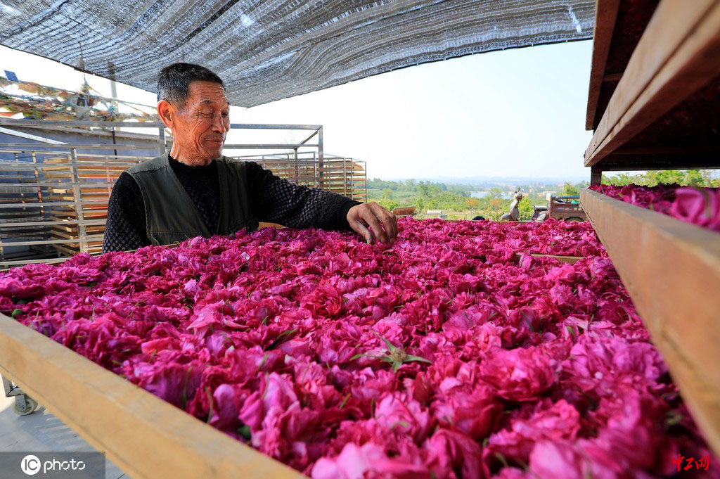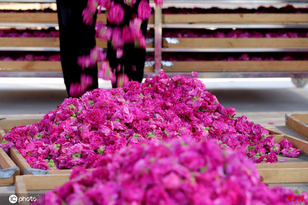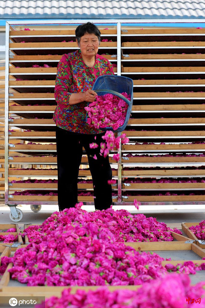 2021年5月19日,日前,在山东省荣成市夏庄镇一处玫瑰园里,百亩食用玫瑰花竞相绽放,花香四溢。花农们伴着花香采摘、分拣、烘干,供应市场需求。近年来,荣成市积极推进花卉生态种植与乡村旅游业融合发展。以玫瑰、百合等花卉种植、加工、休闲旅游为一体的田园综合体,已成为当地群众增收致富、乡村振兴的经济来源之一。