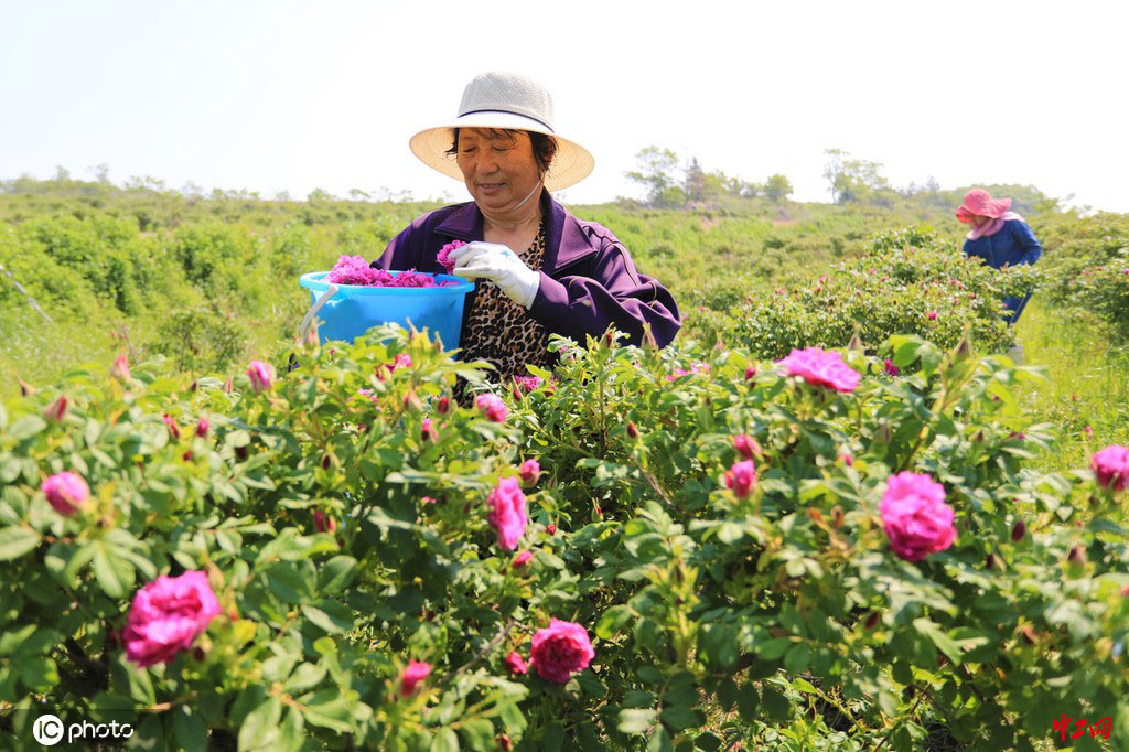 2021年5月19日,花农在山东省荣成市夏庄镇一玫瑰园内采摘玫瑰花。(IC photo)