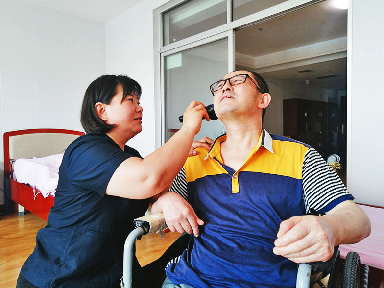 在张盈负责的院区里,有一位特殊的“老年人”,这是养老院里一对老夫妇的孩子,在唐山大地震中虽然侥幸捡回生命,但是智力却严重受损。