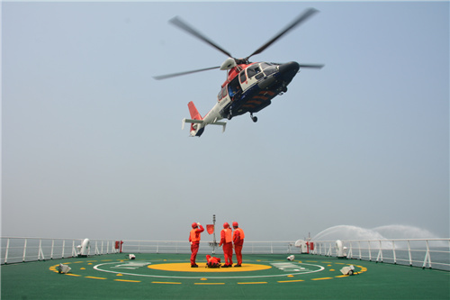 班组中23名小伙子常年随船驻扎海边,军事化的管理和经年累月的严格训练使小伙子们各个“身怀绝技”,又A又飒。岸滩、水域溢油围控及回收、救生艇落水人员转移……应急队员们经历过太多惊涛骇浪,快速机动、连续作战是他们多年岗位练兵的成果。图为应急队员们日常开展遇险人员直升机转移训练。(崔姝羿)